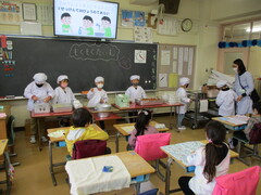 初めての給食です。ゆっくり、しっかりと準備をするため、準備は全学級で4校時から始めました。担任だけでなく、専科の教員や栄養士も一緒になって指導しました。手をしっかり洗った後は、給食当番さんが準備をして、呼ばれた順から配膳が始まります。教室から一旦廊下に並んで順番を待ちます。もらった後は静かに自分の席で、みんなの配膳が終わるのを待ちます。4クラスとも様子を見ましたが、昨日練習していたこともあり、混乱なく給食を受け取ることができました。献立は1年生の初めての給食を意識して、配りやすいもの、食べやすいものになっています。本日は「ホットドッグ」「にんじんポタージュ」「ブロッコリーサラダ」「牛乳」です。感染症対策もあります。静かに落ち着いて食べてほしかったので、食べている様子までは見ませんでしたが、残さず食べられたでしょうか。ぜひご家庭で感想を聞いてみてください。月曜日は「春野菜のカレーライス」「ハーブチキンサラダ」に、デザートの「みかんゼリー」が出ます。来週の給食も楽しみにしていてください。