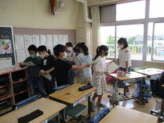 1年生は登校して教室に行くと、6年生が教室で待っていて、始業前の準備の仕方を教えてくれます。ランドセルから荷物を出して、ランドセルをロッカーにしまって、手を洗ったり名札を付けたりと結構することがあります。これらを1年生自身が習慣化できるようになるには少しだけ時間がかかります。そのお手伝いを毎年6年生がしてくれます。やさしく声を掛け、教えている6年生、ありがとう。やがて今の1年生が6年生になるときに同じように1年生に親切にして、そのバトンは引き継がれます。