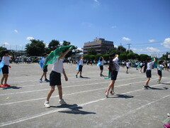 今日は外部から講師の先生をお招きして教えていただきました。普段通り、水着で準備運動などをしてから、衣服を身に付けプールの中に入ります。今回の授業では靴は履きませんでした。川や海に落ちたときには靴を脱ぐことも必要です。授業では、まずは衣服を着ている時の水の抵抗を感じるために、水の中を歩いたり、泳ぐとどんな様子になるかを確かめたりしました。確かに短い距離は泳げますが、泳ぐのは体力的にきつそうです。その後は服を着た状態で、写真のように浮く練習をしました。お腹が沈むと体全体が沈んでしまいます。コツをつかむと浮いていられるようになります。その後、ペットボトルをうまく利用して浮かぶ練習もしました。