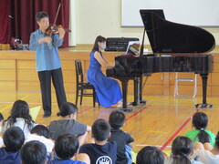 今日は3校時、4校時で4年生と6年生がヴァイオリンとピアノの演奏を体育館で聴きました。実は一昨年もこのコンサートを行いました。今回、5年生は他の演奏会を用意していますので、この2学年が演奏を聴きました。音楽専科教員が企画をしてくれたこのコンサートは、間近でヴァイオリンとピアノの演奏を聴くことができます。クラッシックに親しむにはまたとない機会となりました。
