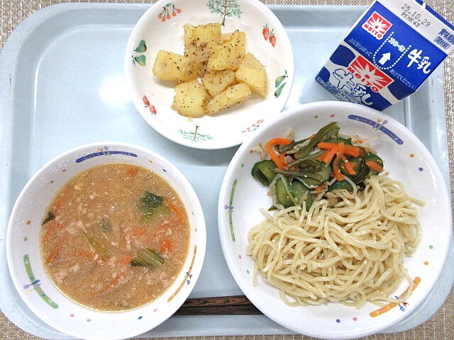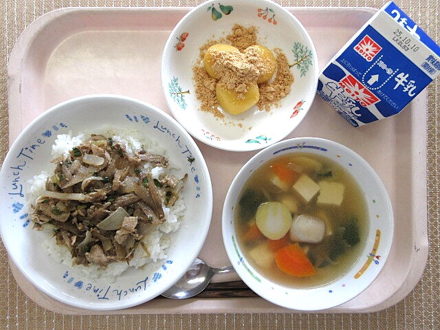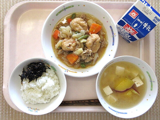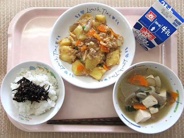 揚げじゃがいものそぼろ煮 みそけんちん汁 牛乳
