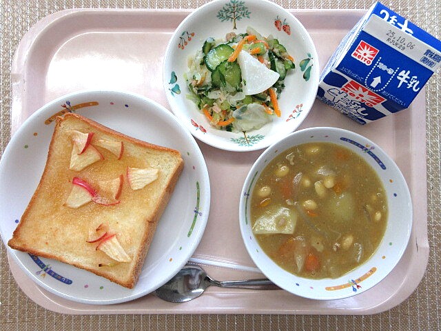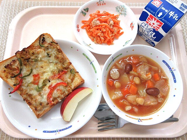 ミックスビーンズのトマトのスープ りんご 牛乳