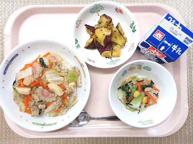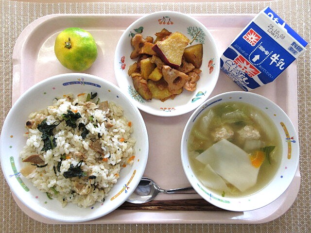 さつまいもと蓮根の甘辛炒め 早生みかん 牛乳