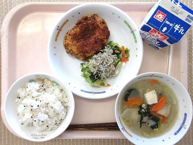 カリカリじゃこサラダ 五目汁 牛乳