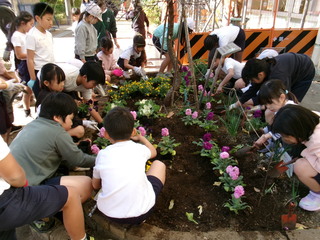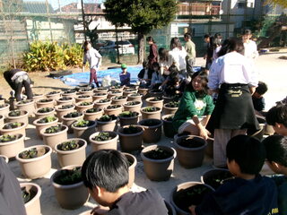 12月1日(月曜日)秋の花プロジェクトで6年生はパンジー、ネモフィラとチューリップの寄せ植えを81鉢作りました。6年間の経験を活かし、全員で協力して鉢を作りあげました。春にはきれいな花が咲くと思います。