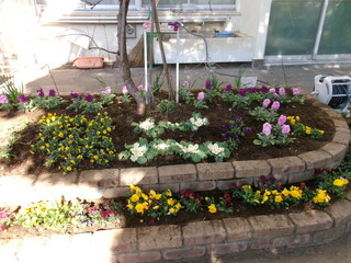 また、3年生は玄関前の花壇の整備をしました。パンジー、ビオラ、ストックなどを設計図にそって植えました。株の数が多く、植えるのが大変でしたが役割分担をして時間内に植えることが出来ました。
