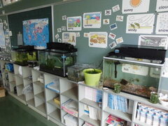 そこにクラスの友達が持ってきてくれたメダカが3匹。各班で観察するためにメダカを100匹購入。大所帯になり、また水槽が必要だと感じ、プラス2つ追加。何も生き物がいなかった外国語ルームがまるでアクアリウムへと大変身。