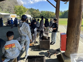 移動教室3日目は、秋晴れの絵画のような風景のなか、野外炊事を行いました。