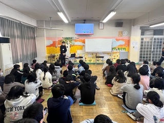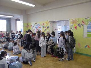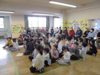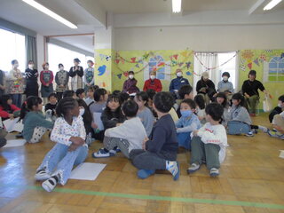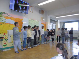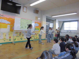 収穫を祝い、野菜について教えてくださったお客様を招いて、鶏肉入り大根汁を味わい、豆知識や劇などを発表する大根パーティーを開催しました。(2年1組担任)