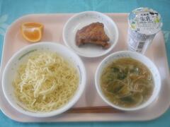 しょうゆラーメン鶏肉の塩こうじ唐揚げはれひめ(柑橘類)飲むヨーグルト