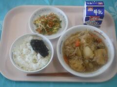 ごはんのりの佃煮肉じゃが茎わかめのごま和え牛乳