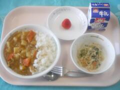 防災とボランティアの日アルファ化米(備蓄米)ポークカレー切干大根と小松菜のサラダいちご牛乳