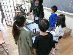 「たぬきの糸車」に登場する糸車体験がありました。子どもたちは、初めて見る糸車に興味津々でした。綿から糸を紡いでいく方法を実演してもらうと、「手でよじるよりも簡単に出来るんだね。」「小さくキーキーと音がするよ。」など、驚きと発見の言葉を口々に出していました。物語の世界へ一層興味をもちました。