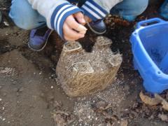 11月18日(水曜日)に学校の畑に行き、アサガオの鉢の土の片づけをしました。鉢をひっくり返した土の中から出てきた根っこや虫を観察しました。子どもたちは、外から見えなかった鉢の中には根っこが広がっていること、虫も住んでいることなどに驚きを交えながら知ることができました。また、アサガオを育てている土や、畑の土と校庭の土では触り心地が違うことにも気づき、植物を育てる意欲を高めました。
