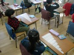今までに習った、平仮名、片仮名、漢字の学習を振り返りながら、書き初めの学習に取り組みました。文字の形や書き順に気をつけて、ゆっくりと丁寧に書くことをめあてに掲げ、いざ、本番へ!一文字一文字、心を込めて書くことができました。子供たちは、正しい姿勢と鉛筆の持ち方も丁寧な字を書くために大切なことなんだ、と改めて実感していました。三学期の書き初めの学習も楽しみです。