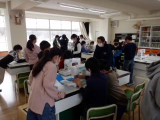 卒業に向けての取り組みの奉仕活動で、上小の伝統の一つ、あいさつ当番で使うたすきを作りました。扱いに慣れたミシンを使って縫い、仕上げはポスターカラーを使ってきれいに文字を書きました。