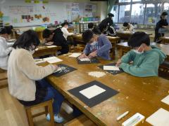 自分の名前の一文字をデザインし、三枚の板を彫り分け、それぞれの版を重ねて表す多版多色版の活動です。6年生は、今までの版画の経験を生かし、難しい工程をよく理解し、主体的に楽しんで取り組んでいました。色の重なりが美しい版画が刷り上がりました。