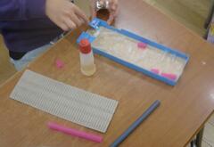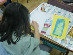 御家庭からお持ちいただいた、トイレットペーパーの芯や緩衝材などを使って、形写しの学習を行いました。