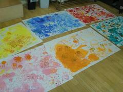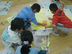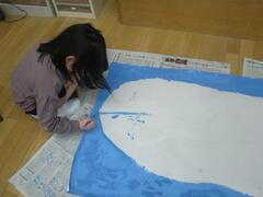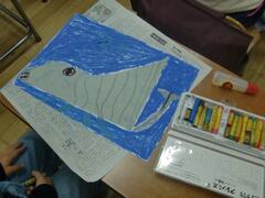 発表で使うくじらぐもや背景の絵は、飾りグループの子どもたちが頑張って仕上げています。