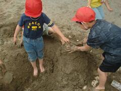 図工科「すなやつちとなかよし」の学習を校庭の砂場で行いました。裸足になり、手や足、水も使いながら全身で土遊びをしました。「ダムができたよ!」、「大きな土の山をつくるよ!」など、思い思いにいろいろな形を作り上げることができました。
