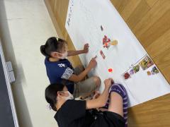 今日は机を廊下に出して長い紙を床に広げて書きました。