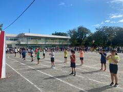 体力テストに向けて、5年生は2年生のシャトルランの回数を数えるお手伝いをしています。