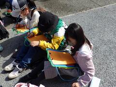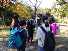 次は、全員で「グリーンアドベンチャー」に挑戦しました。地図に載っている番号の木を見付け、見付けた木の名前を予想しながら進んでいくゲームです。子どもたちは班ごとに、公園に広がっている18種類の木を一生懸命探していました。名札が付いている木は正解が分かりやすいのですが、名札が付いていない木もあり、かなり難しい問題もありました。しかし、どの班も最後まであきらめず、2時間近くかけて、全ての班がゴールすることができました。全問正解した班が多数あり、驚かされました。