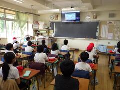 園児の皆さんが到着すると、1年生が園児の手を引いて教室まで案内しました。教室に全員が入ると、「はじめの会」です。1年生が司会を務めたり、メッセージを言ったり、クイズを出したりと、てきぱきと進行する姿は見事でした。また、トイレに行きたい園児のためにトイレまで案内してあげるなど、すっかりお兄さん、お姉さんに見えました。