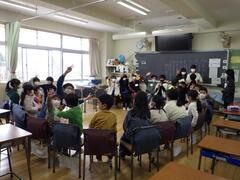 今年度は2部構成で、前半はフレンド班でのお別れ会でした。5年生が中心となって、お別れ会の準備をしてくれました。班ごとに、6年生にプレゼントとメッセージを渡した後、ゲームタイムになりました。フルーツバスケットやいす取りゲームなど、5年生が考えた遊びで楽しく遊びました。