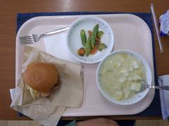 今日のメニューは、セルフ照り焼きチキンサンド、アスパラサラダ、クリームコーンシチュー、牛乳です。照り焼きチキンサンドは、1年生が配膳しやすいように、調理員さんが、あらかじめサンドして紙に包んでくれました。また、各学級には、準備や片付けの補助のため、複数の教職員が入りました。