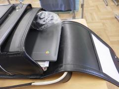 本日、5・6年生の子どもたち一人一人にタブレットを配布し、使い方を学ぶ授業を行いました。まず、IDやパスワードを入力し、ログインするところから始めました。大文字を入力する際に苦労している子もいましたが、さすが高学年、全員が早々にログインを済ませ、様々な機能を使って楽しんでいました。カメラ機能を使って写真を撮っている学級や、グーグルクラスルームの機能を使って、担任が出した課題に対する答えを提出している学級もありました。また早速、「eライブラリ」で算数や国語のドリル問題に各自取り組んでいる学級もありました。