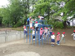 9時10分に学校を出発して、あっという間に小金井公園に到着です。最初は遊具で、自由に遊びました。他の団体の姿はなく、ほぼ貸し切り状態で、滑り台やブランコ、ターザンロープなどの遊具を思う存分楽しむことができました。