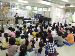 2年生が音楽室に集まると、音楽講師の読み聞かせが始まりました。その読み聞かせに合わせて、琴の先生の琴の生演奏が聞こえてきました。心地よい音楽を聴きながら、子どもたちはお話の世界にどんどん浸っていきました。