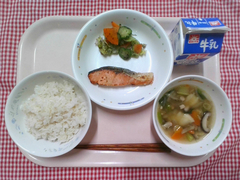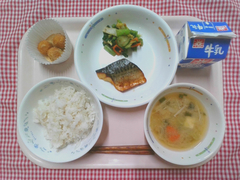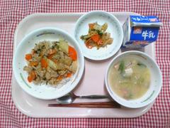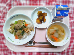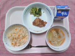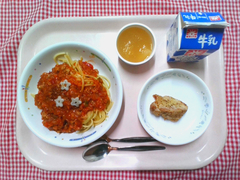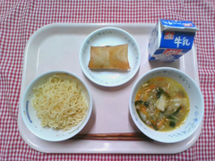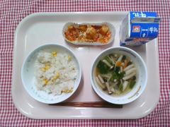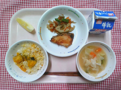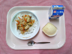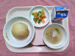 丸パンにクッキー生地をのせて焼いた、手作りメロンパンです。オーブンで焼くとバターが溶けて、帽子をかぶった可愛らしい形になりました。子どもたちの中には「甘すぎる!」と大人な意見もありましたが、取れてしまったクッキー生地の争奪戦になっているクラスも多く、大人も子どもも大興奮の献立でした。