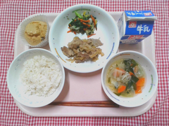 「キャベすき丼」は西東京市栄養士連絡会の共通献立です。市内の小中学校、保育園で提供されます。けやき小では、田倉農園さんのキャベツ、にんじん、中野農園さんの小松菜を使用しました。すき焼きのような甘じょっぱい味付けです。