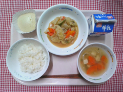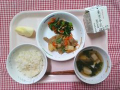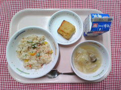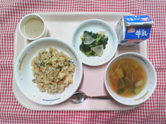 小松菜炒飯の小松菜は、西東京市の中野農園さんから届きました。3年生の社会で、中野農園さんの小松菜について学習しています。授業中スライドで見た小松菜の写真が、実際目の前にでてきて食べる、という指導ができるは給食ならではの特権です。地域の方々にご協力いただきながら、子どもたちにとって食や農業を身近に感じる機会を増やしていきたいです。