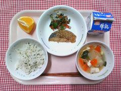 本日より3学期の給食スタートです。正月&七草献立です。紅白なますはほんのりゆずを効かせ、さっぱり仕上げました。