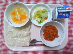 タイムスリップ給食最終日です。明治から昭和までタイムスリップしてきましたが、令和の現在の給食はどうでしょうか。和食を中心とし、四季の移ろいを感じながら、郷土料理や世界の料理まで、様々な料理を手作りで提供しています。今日の汁物、こづゆとは、福島県の郷土料理です。本来は干しホタテ貝柱を使用しますが、レトルトホタテ貝柱で代用しました。