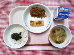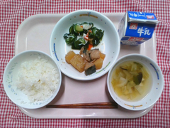 3年生の社会科で農家の仕事を学習しています。田無第三中学校の目の前の畑を持つ、中野農園さんをお招きし、子どもたちが中野さんにインタビューをおこないました。実際にお会いすることで、農家や野菜をもっと身近に感じることのできる学習となりました。今日のスープの小松菜は西東京市の中野農園さんのものを使用し、さらに実りのある学習へと繋げました。