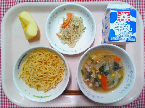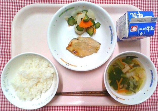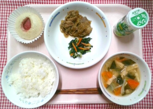 今日は、スタミナたっぷり豚肉のしょうが焼きにしました。進級してから1回目の給食でしたが、「お肉がおいしかった!」と喜んで食べていました。