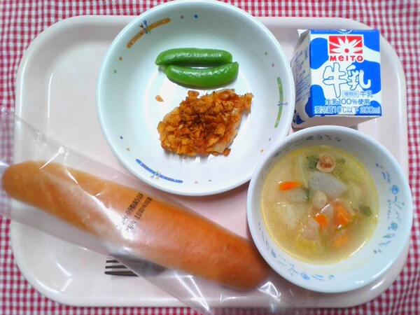 クリスピーチキンの衣にはコーンフレークを使用しました。衣だけをおかわりしにきた!と笑顔で食べている姿が見られました。