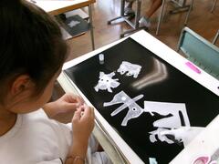 本日、9月14日(木曜日)3年生が図工で「ふしぎなとうめい生物」を作っていました。白い紙を好きな形に切り黒い紙に貼っていました。重なりを楽しみながら貼り、たくさんの「ふしぎなとうめい生物」ができました。最後にシールで目を付けるととってもかわいらしい生物になりました。