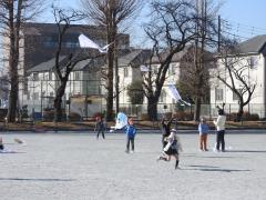 1年生の生活科の授業では、昔遊びの学習をしています。凧揚げ、こま回し、羽根つき、けん玉など昔からある遊びを通して学習をしています。凧は一人一人の児童の手づくりです。どうすれば凧がうまく揚がるかをかを確かめながら学習していました。