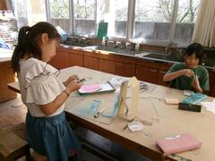 10月7日(月曜日)4年生が図工で「ティッシュ・アート」と「ビーンズハウス」を制作していました。「ティッシュ・アート」では、折りたたんだティッシュペーパーにインクを吸わせ自分だけの色模様をつくっていました。作品ができた子どもたちは「ビーンズハウス」の制作に移っていました。何にでも丁寧に取り組む子どもたちです。