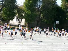 大玉を落とさないように送る3,4,5,6年生