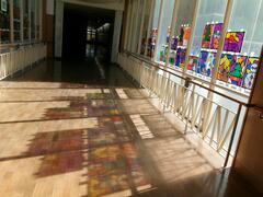 11月29日(金曜日)本日も授業参観を実施しました。渡り廊下に暖かい日差しが入り、ステンドグラスの影絵がきれいに映っていました。少し疲れが出てくる曜日ですが、子どもたちは授業参観でお家の人などに見に来てもらい嬉しそうでした。週末はゆっくりお過ごしください。