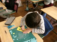 本日、1月15日(月曜日)2年生が図工で「まどのあるたてもの」の学習をしました。建物の窓の形を決めてカッターで切りました。鉛筆のようにカッターをもち、「チクッ、スー」とカッターを自分の方に引くようにして切りました。安全に気を付けてたくさんの窓を作ることができました。