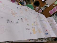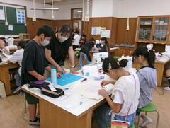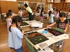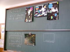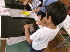 9月8日(月曜日)1年生が図工で「宇宙の世界」を描いていました。子どもたちは絵具を付けた筆を指ではじいて色を付けていました。たくさんの星が輝くすてきな「宇宙の世界」ができました。