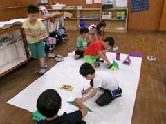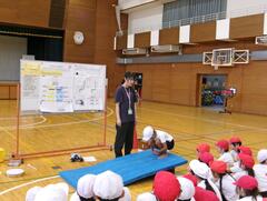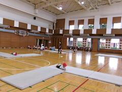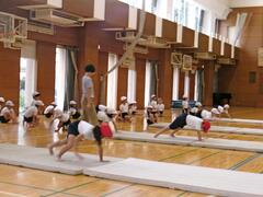9月9日(火曜日)2年生が体育でマットを使った運動遊びを行っていました。動物歩きや前転がりなどした後、ジグザグコースやさかみちコース、シンクロコースなどの場で、いろいろな動きを楽しんでいました。