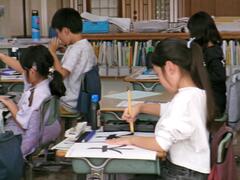 筆を立てて書く3年生